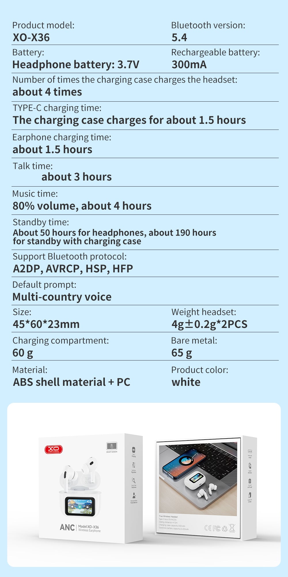 XO X36 Funciones de auriculares Bluetooth de pantalla inteligente ANC: